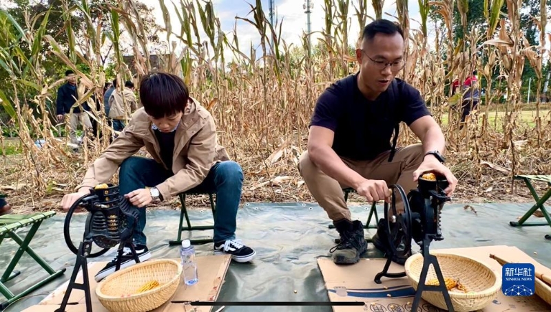 10月19日,臺灣記者體驗剝玉米粒。新華社記者 王承昊 攝