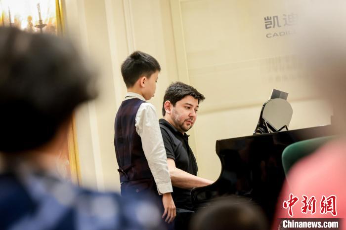 鋼琴家貝佐德·阿布杜瑞莫夫?qū)π∏偻M(jìn)行“一對(duì)一”鋼琴演奏技巧指導(dǎo)?!∩虾R魳窂d 供圖
