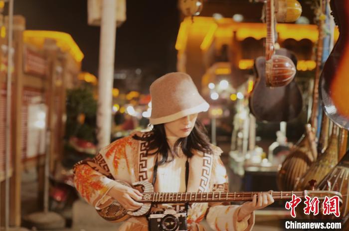 在新疆莎車縣的夜市里,何泓姍體驗(yàn)了新疆傳統(tǒng)民族樂(lè)器。(受訪者供圖)