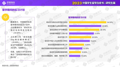 留學(xué)生普遍重視實習(xí)經(jīng)驗,AI、新能源與新材料成為就業(yè)新賽道。啟德留學(xué)調(diào)研數(shù)據(jù)顯示,七成以上的中國留學(xué)生在研究生留學(xué)期間考慮在當(dāng)?shù)貙嵙?xí),主要實習(xí)形式包括“嘗試在當(dāng)?shù)仄髽I(yè)找尋實習(xí)崗位”(34.5%)、“嘗試拍攝vlog做自媒體博主”(29.9%)、“嘗試遠程PTA等項目”(28.1%)。實習(xí)的主要原因為“提升英語口語能力”(53.1%)、“體驗當(dāng)?shù)厣睢保?0.2%)、“為就業(yè)準(zhǔn)備、補充與從事行業(yè)相關(guān)的實習(xí)經(jīng)歷”(39.9%)。在碩士畢業(yè)后的規(guī)劃中,31.93%的學(xué)生選擇“同時應(yīng)聘國內(nèi)和海外的工作”,選擇“回國求職”與“海外求職”的占比分別為21.77%與12.93%,另有13.55%的學(xué)生選擇繼續(xù)深造。