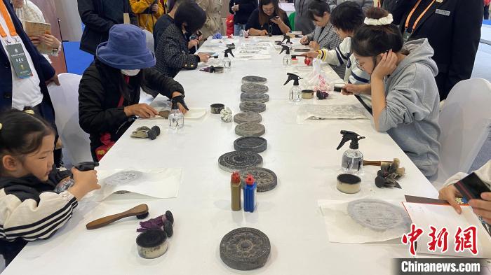拓印體驗區(qū)排起長龍,“大家還是比較愿意去體驗和感受的,通過自己動手,最后的作品還可以互相對比,做完以后還是很開心的,而且各個年齡層,老人孩子都有參與?!痹茖芯吭汗ぷ魅藛T李朋飛介紹。