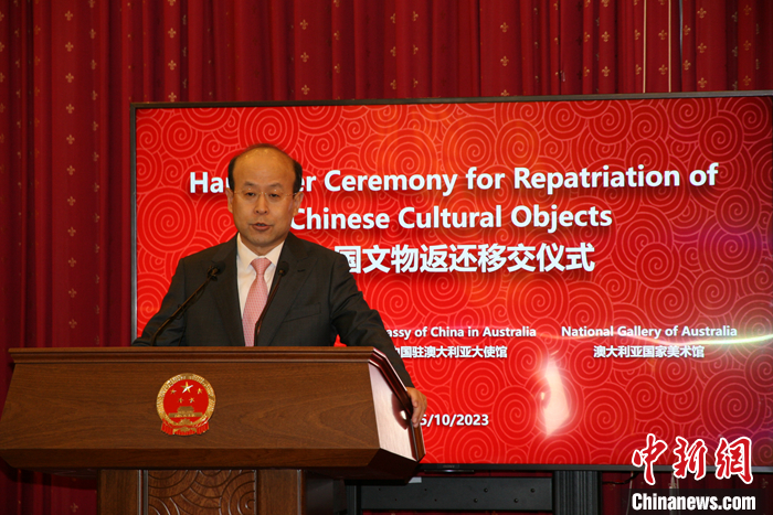 當(dāng)?shù)貢r間10月25日上午,經(jīng)中國國家文物局授權(quán),中國駐澳大利亞大使館在堪培拉舉行儀式,接收澳方向中國返還共4件流失文物藝術(shù)品與1件古生物化石。中國駐澳大利亞大使肖千在致辭中表示,這些文物回歸祖國,顯示了中澳兩國政府對于保護文化遺產(chǎn)的共同承諾,是雙方文化遺產(chǎn)交流的一次盛事和友好合作的見證。 中新社記者 顧時宏 攝