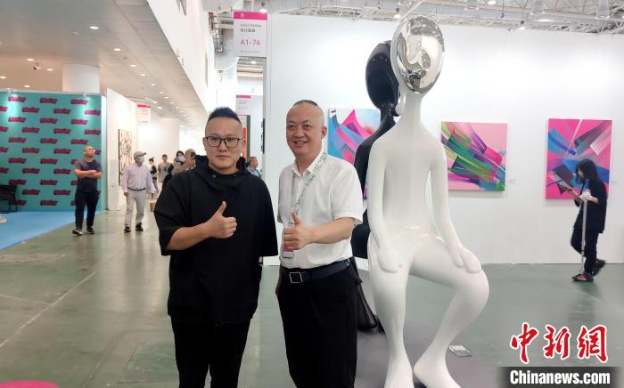 藝術(shù)廈門博覽會組委會主任羅文軒(右)與藝術(shù)家蘇武在《wake up覺》作品前合影。中新網(wǎng)記者 楊伏山 攝