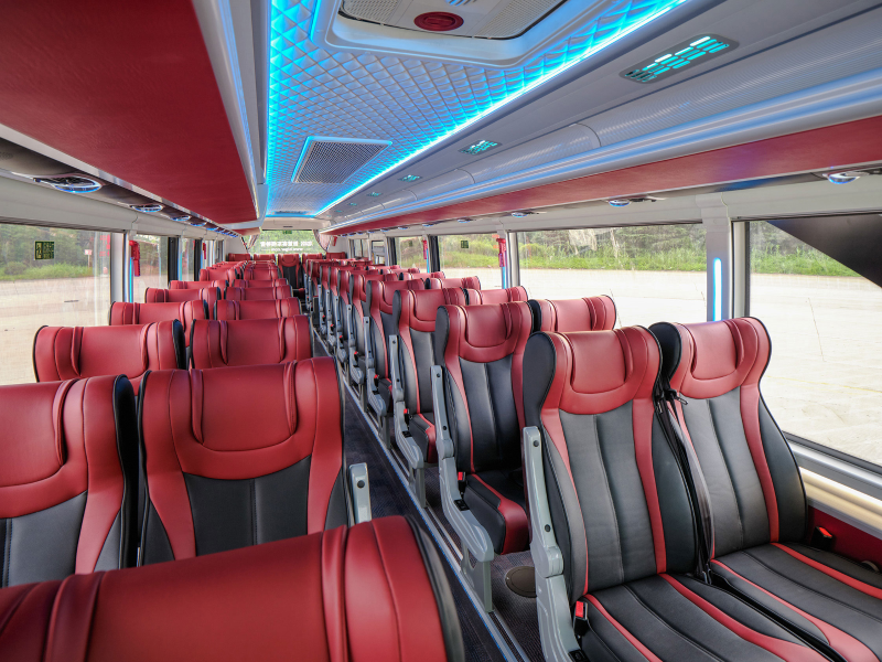 外觀造型上,海格蔚藍(lán)KLQ6856車長8.5米,前臉采用極具辨識(shí)度的大V造型,銀黑藍(lán)三色搭配,科技感十足,極具視覺沖擊力。車內(nèi)采用低地板前后開門布置,色彩搭配新穎,設(shè)有LED氛圍燈,可營造更加溫馨愉悅的乘車體驗(yàn)。全部通道無臺(tái)階的設(shè)計(jì),增加了車輛站立面積,使得最大載客達(dá)到80人,為行業(yè)最高。