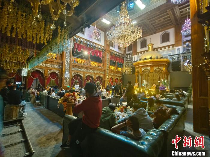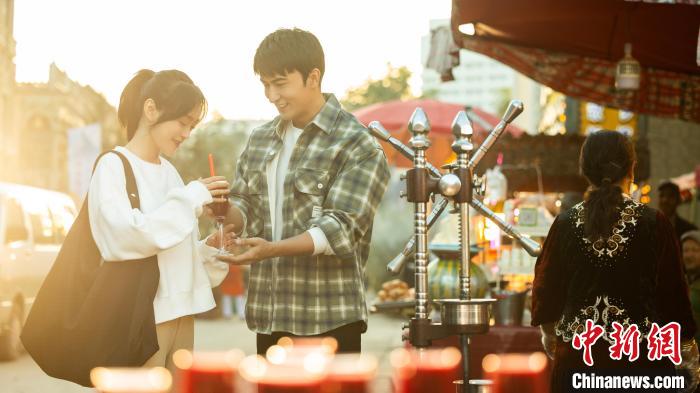 男主角阿迪江在莎車縣老城區(qū)街道帶著女主角沈淺淺品嘗美食。(夏雪成 攝)
