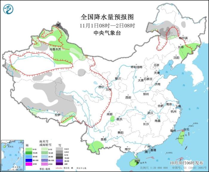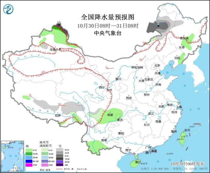 10月30日08時(shí)至31日08時(shí),新疆阿勒泰地區(qū)、內(nèi)蒙古東北部、西藏東部、川西高原南部等地部分地區(qū)有小到中雪,其中,新疆阿勒泰北部、內(nèi)蒙古東北部等地局部地區(qū)有大雪或暴雪(10~15毫米)。黑龍江東南部、吉林中東部、遼寧東部、四川東南部、云南南部、海南島、臺(tái)灣島等地部分地區(qū)有小雨。新疆南部、甘肅西部、內(nèi)蒙古、西藏中西部等地部分地區(qū)有4~6級(jí)風(fēng),其中,內(nèi)蒙古中部、西藏北部等地部分地區(qū)有6~7級(jí)風(fēng)。