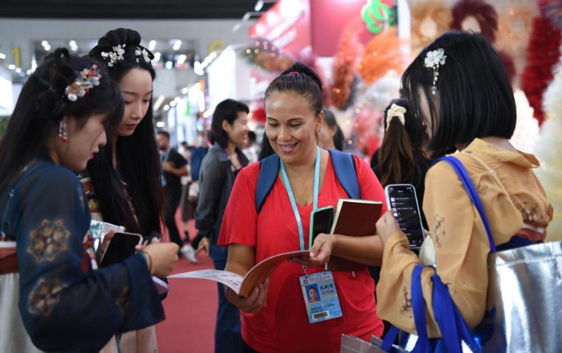 10月23日,外國采購商(中)與參展商工作人員洽談。新華社記者 鄧華 攝