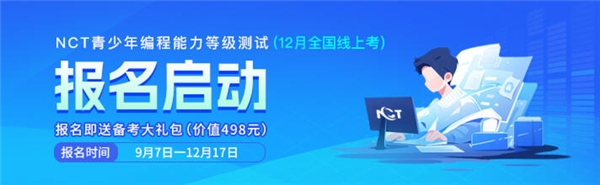 2023年NCT青少年編程能力等級測試12月考將于12月23日-12月24日舉行,12月17日截止報名,成功報考的考生可獲得免費備考福利包(價值498元),具體詳情可前往“NCT青少年編程能力等級測試”微信公眾號了解。