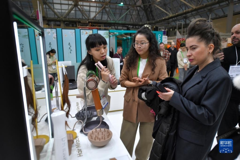 10月30日,在俄羅斯首都莫斯科,人們在中國消費品(俄羅斯)品牌展覽會上查看展出的美發(fā)用品。