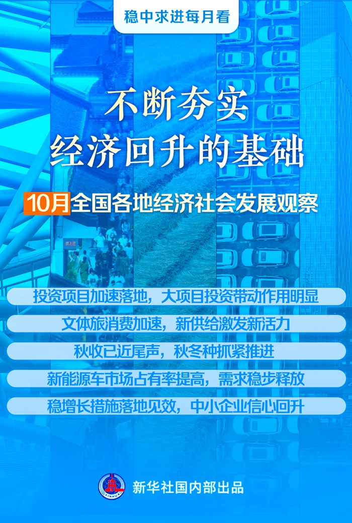 投資項目加快落地、文體旅消費熱度攀升、中小企業(yè)信心回升……隨著一系列政策組合拳加快落地實施,10月份各地加快推進經(jīng)濟社會發(fā)展。進入四季度,各方堅定信心,落實好經(jīng)濟社會發(fā)展各項重點任務,不斷夯實經(jīng)濟回升的基礎,為實現(xiàn)全年發(fā)展目標打下堅實基礎。