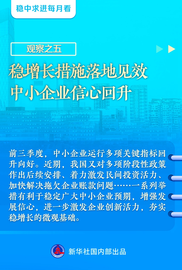 【記者觀察】前三季度,中小企業(yè)運行多項關鍵指標回升向好。近期,我國又對多項階段性政策作出后續(xù)安排、著力激發(fā)民間投資活力、加快解決拖欠企業(yè)賬款問題……一系列舉措有利于穩(wěn)定廣大中小企業(yè)預期,增強發(fā)展信心,進一步激發(fā)企業(yè)創(chuàng)新活力,夯實穩(wěn)增長的微觀基礎。