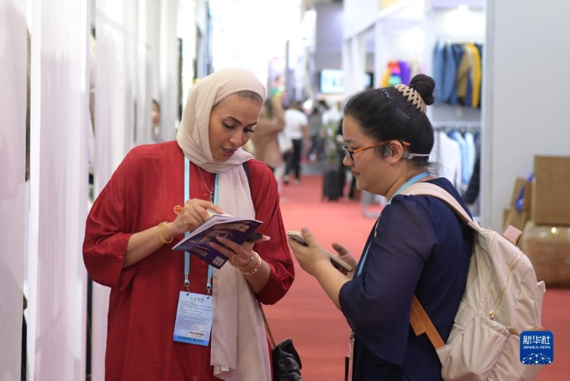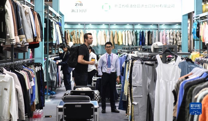 10月31日,外國采購商在服裝展區(qū)參觀洽談。