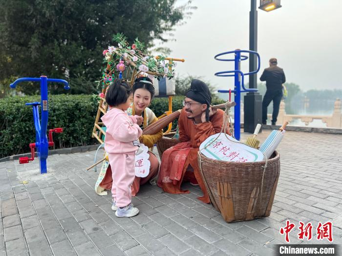 當(dāng)天抵達(dá)北京通州漕運(yùn)碼頭后,作為此次“千年運(yùn)河千里行”采風(fēng)團(tuán)成員代表,身著漢服,背著竹簍的國(guó)風(fēng)博主杭州“送花姑娘”陳喜悅與挑著擔(dān)子的伙伴“貨郎一青”,一同將從杭州帶來(lái)的百年老店方回春的膏方香囊、網(wǎng)紅書(shū)店曉風(fēng)的文創(chuàng)絲巾以及運(yùn)河畫(huà)家吳理人的作品等,贈(zèng)送給北京市民游客,分享來(lái)自杭州的江南文化。