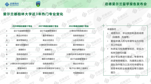 據(jù)了解,在本科申請中,除了都柏林大學(xué)和都柏林圣三一大學(xué)要求中國內(nèi)地學(xué)生提供高考成績,其他國立大學(xué)、理工大學(xué)/學(xué)院及獨立學(xué)院可以通過高中成績進行申請。在碩士階段的申請中,都柏林圣三一大學(xué)對學(xué)生的本科院校有名單要求,其他院校沒有限制。2022年,都柏林大學(xué)碩士專業(yè)申請總量的TOP3專業(yè),已從商科類的會計與金融管理碩士、數(shù)字營銷碩士、商業(yè)分析碩士轉(zhuǎn)變成工科類的計算機科學(xué)(轉(zhuǎn)換)碩士、信息系統(tǒng)碩士、人機交互碩士。