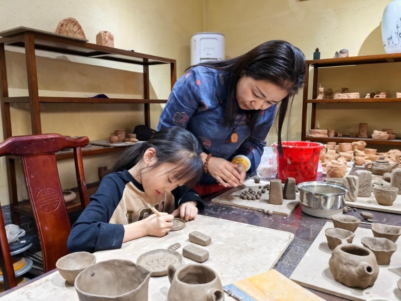 張金霞在教小朋友制作澄泥擺件。新華社記者 袁敏 攝