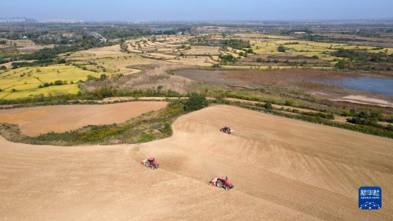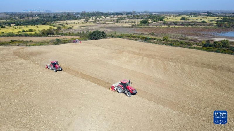 11月2日,在合肥市蜀山區(qū)小廟鎮(zhèn),農(nóng)民駕駛農(nóng)機(jī)在田間播種小麥(無(wú)人機(jī)照片)。
