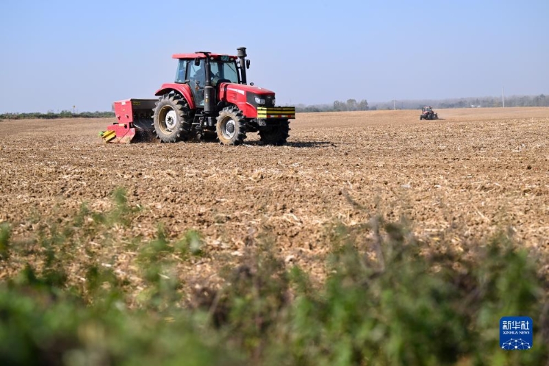11月2日,在合肥市蜀山區(qū)小廟鎮(zhèn),農(nóng)民駕駛農(nóng)機(jī)在田間播種小麥。