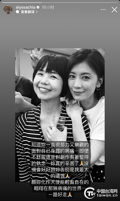賈靜雯發(fā)文悼念陳慧翎。(中國臺灣網(wǎng) 發(fā))