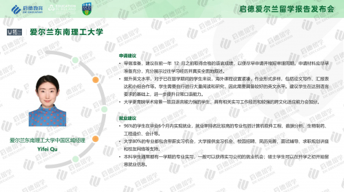 愛爾蘭東南理工大學(xué)中國區(qū)域經(jīng)理Yifei Qu指出,該校96%的學(xué)生在畢業(yè)后6個(gè)月內(nèi)實(shí)現(xiàn)了就業(yè)。高就業(yè)率的專業(yè)包括計(jì)算機(jī)軟件工程、數(shù)據(jù)分析、生物制藥、工程造價(jià)和會(huì)計(jì)等。東南理工大學(xué)的80%專業(yè)都包含帶薪實(shí)習(xí)機(jī)會(huì),許多學(xué)生在大三的暑期實(shí)習(xí)結(jié)束后獲得了公司的工作offer,可在大四畢業(yè)后直接就業(yè)。該校提供一系列支持,包括實(shí)習(xí)機(jī)會(huì)、校園招聘、簡歷改進(jìn)、面試輔導(dǎo)、求職規(guī)劃講座以及校友網(wǎng)絡(luò)等,以幫助學(xué)生更好地實(shí)現(xiàn)個(gè)人發(fā)展目標(biāo)與社會(huì)需求的高度契合。