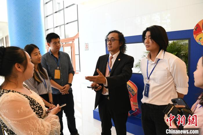 10月31日,參加兩岸媒體壯美廣西行活動的嘉賓們走進香香花園,被園內(nèi)的香味和眾多展品吸引。圖為吳崇豪(左四)和吳育名(左五)接受記者采訪。中新社記者 蔣雪林 攝