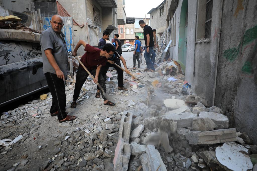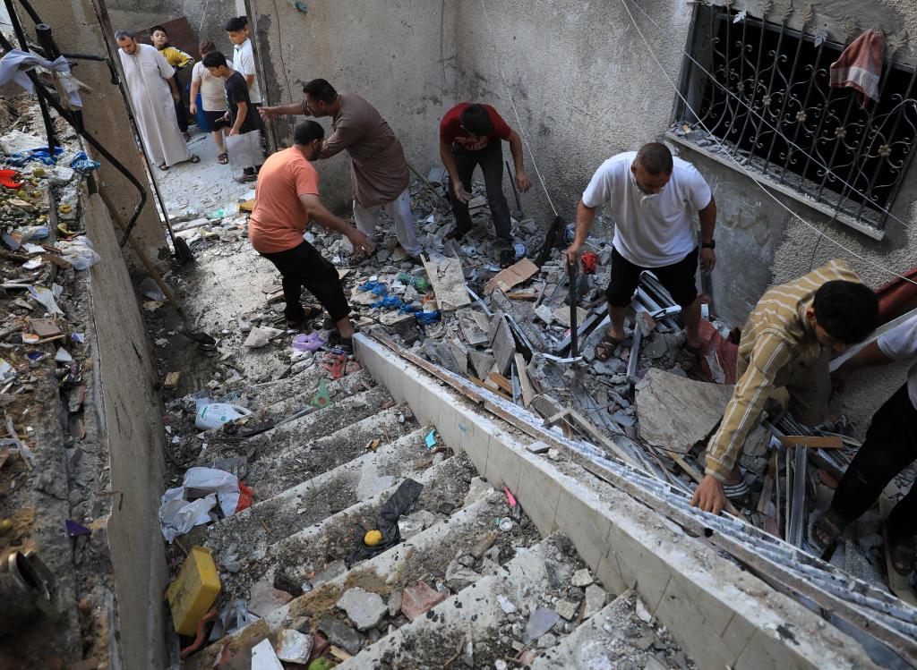 11月3日,在加沙地帶南部城市汗尤尼斯,人們清理遭以色列襲擊后的建筑廢墟。新華社發(fā)(亞西爾·庫迪攝)