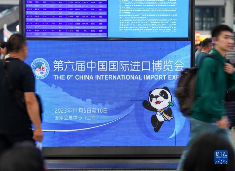 11月3日,旅客在上海虹橋火車站內(nèi)路過第六屆進(jìn)博會海報。