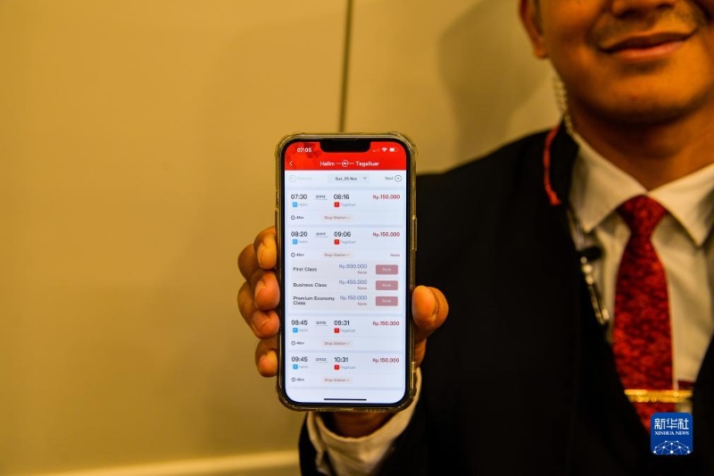 11月5日,一名乘務(wù)人員在行駛中的雅萬高鐵高速動車組列車車廂內(nèi)展示雅萬高鐵購票手機應(yīng)用,當日部分車次車票已售罄。