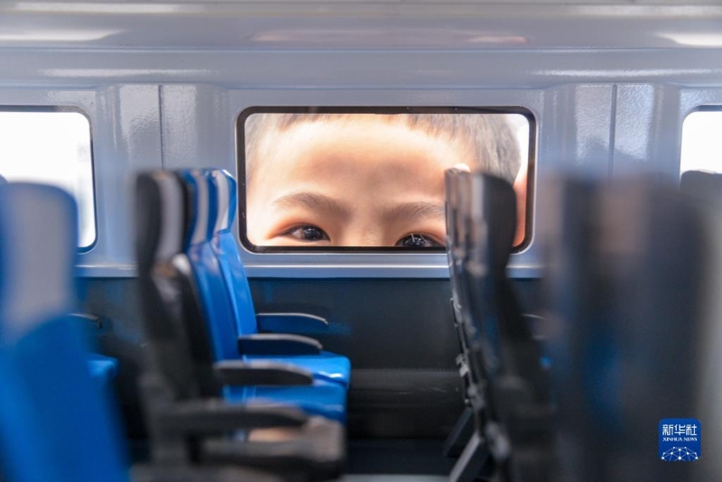 11月5日,在印度尼西亞雅加達哈利姆站候車大廳,一名小朋友在查看一個雅萬高鐵高速動車組模型的內(nèi)部構(gòu)造。