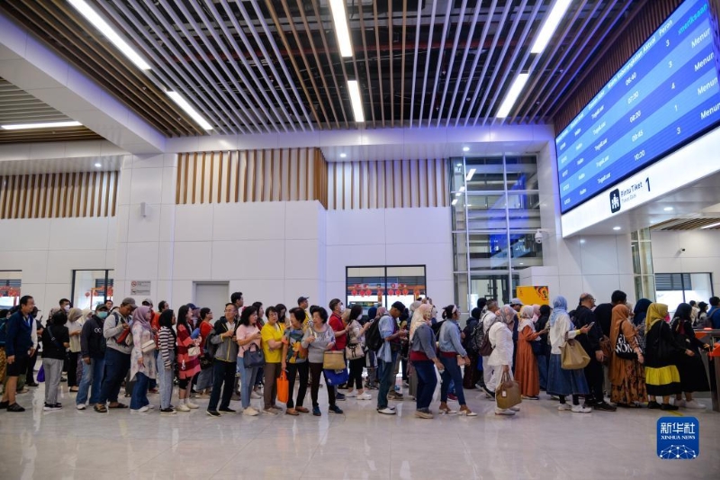 11月5日早,在印度尼西亞雅加達哈利姆站候車大廳,人們排隊準備前往站臺乘坐當日第一班高鐵。