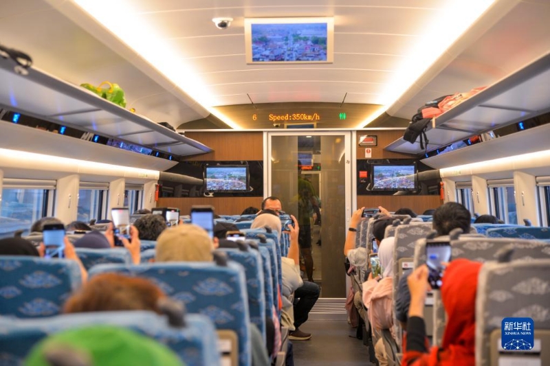 11月5日,乘客紛紛用手機在行駛中的雅萬高鐵高速動車組列車車廂內(nèi)拍攝顯示列車時速達到350公里的電子屏。