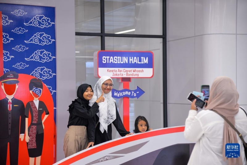 11月5日,在印度尼西亞雅加達哈利姆站候車大廳,人們和一個雅萬高鐵高速動車組模型合影。