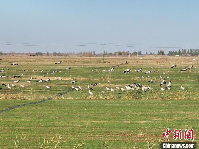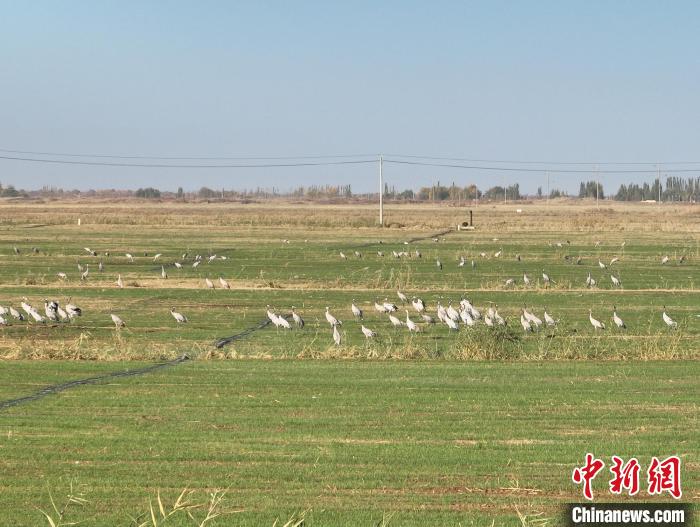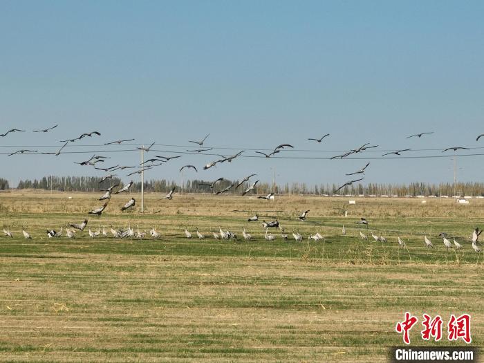 中新網(wǎng)烏魯木齊11月3日電(戚亞平 邢詩 趙春)隨著氣溫逐漸下降,新疆生產(chǎn)建設(shè)兵團(tuán)第十四師225團(tuán)迎來候鳥遷徙季。連日來,上百只國家二級(jí)保護(hù)動(dòng)物灰鶴如約而至,它們時(shí)而在天空翱翔,時(shí)而在田間覓食,鳥兒、藍(lán)天、田野……構(gòu)成一幅靈動(dòng)的秋日畫卷。
