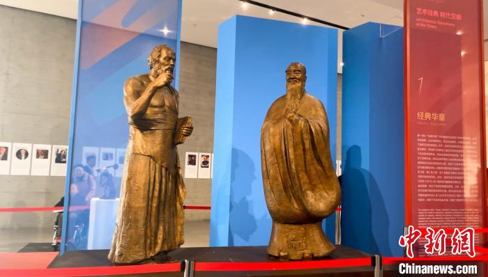 走進藝術(shù)館,首先映入眼簾的是孔子和蘇格拉底的“對話”,這是中國雕塑家吳為山的作品。這樣跨越時空的“對話”,正是此次展覽的一個縮影。