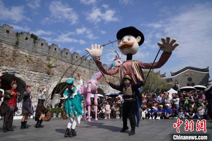 10月28日,《山海經(jīng)》“神獸”表演在廣西桂林市一處明代古城墻下上演。當日,根據(jù)《山海經(jīng)》設計的巨型提線木偶,在明清時期就盛極一時的廣西桂林市正陽東西巷與民眾互動,現(xiàn)場如“主題樂園”。 中新社記者 王以照 攝