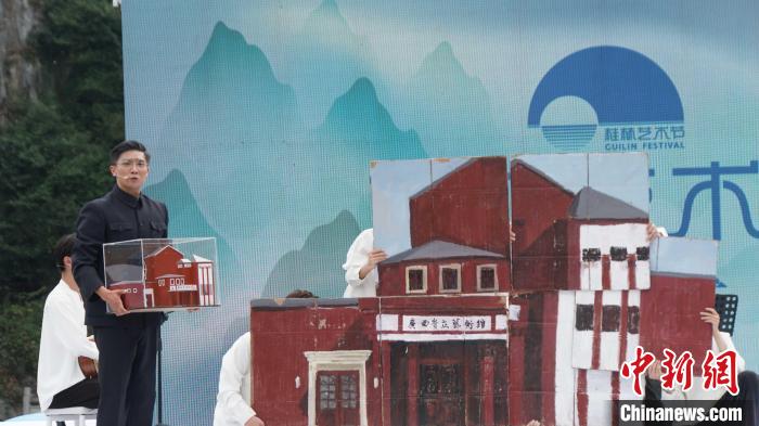 11月5日,2023桂林藝術(shù)節(jié)閉幕式上演原創(chuàng)戲曲片段《在有山有水的地方,建一個(gè)劇場》。圖為演員扮演的歐陽予倩在講述建立劇場的故事。唐蔚晴 攝