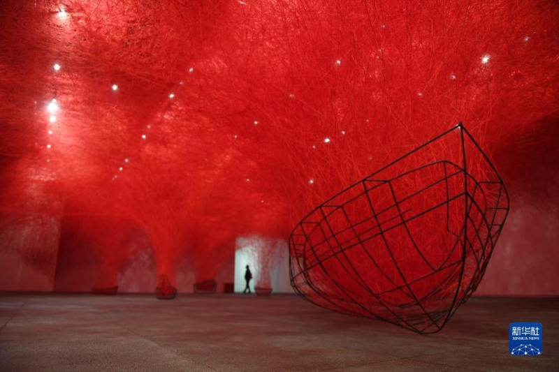 11月6日,參觀者在深圳美術館(新館)的“鹽田千春:顫動的靈魂”展覽上觀賞藝術家鹽田千春的藝術作品。