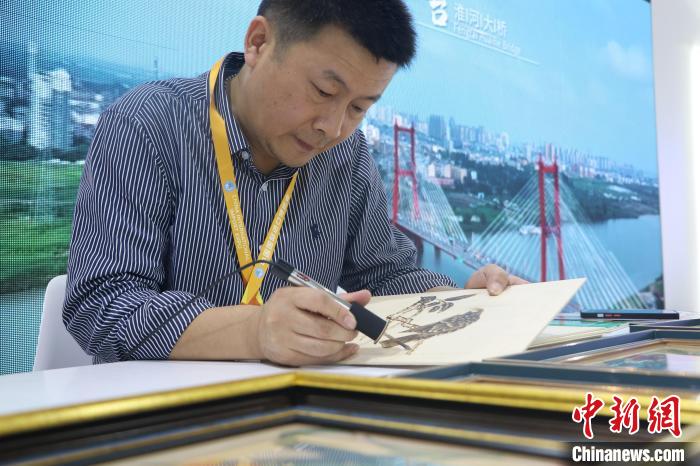 6日,在第六屆進博會上,安徽省工藝美術大師、淮南烙畫非遺傳承人鄭紅偉正熟練地烙繪飛禽畫作。中新社記者 趙強 攝