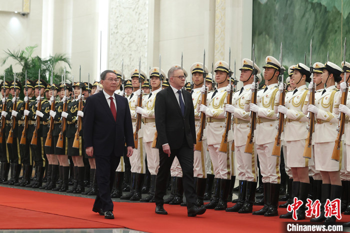 11月7日上午,中國國務(wù)院總理李強(qiáng)在北京人民大會堂同來華進(jìn)行正式訪問的澳大利亞總理阿爾巴尼斯舉行會談。會談前,李強(qiáng)在人民大會堂北大廳為阿爾巴尼斯舉行歡迎儀式。 中新社記者 蔣啟明 攝