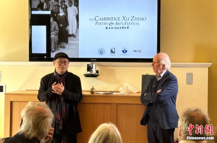 2023年9月,第九屆劍橋徐志摩詩(shī)歌藝術(shù)節(jié)開(kāi)幕。葉錦添(左)在開(kāi)幕式上闡述自己的藝術(shù)觀點(diǎn)。中新社記者 歐陽(yáng)開(kāi)宇 攝
