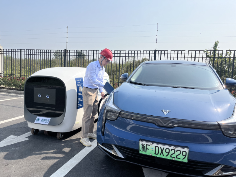 2023年10月17日,國網浙江電力工作人員在烏鎮(zhèn)使用首臺智能移動充電機器人為新能源汽車充電。新華網發(fā) 沈佳煒 攝