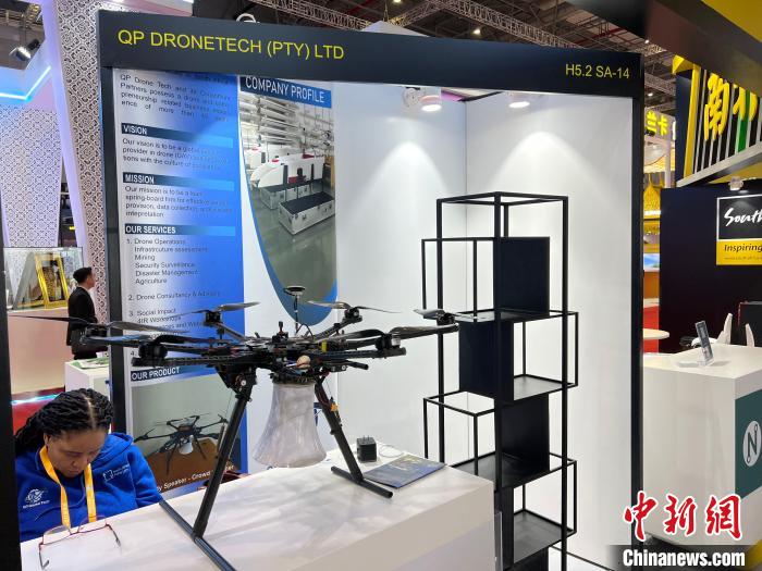 11月7日,第六屆中國國際進口博覽會國家展區(qū)的南非館,展臺上擺放著一架無人機。中新社記者 馬德林 攝