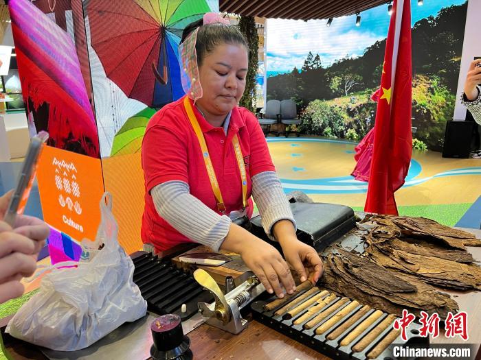 11月7日,第六屆中國國際進口博覽會國家展區(qū)的洪都拉斯館,一位洪都拉斯工作人員正在展示手工制作雪茄。中新社記者 馬德林 攝