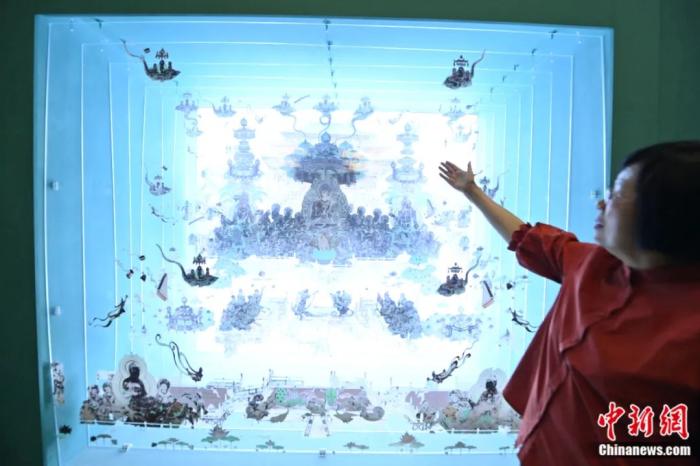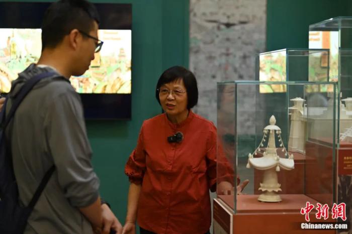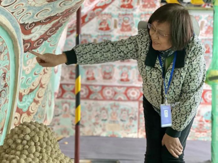 2023年7月14日,孫毅華向中新社記者介紹敦煌壁畫中的建筑形象。李亞龍 攝