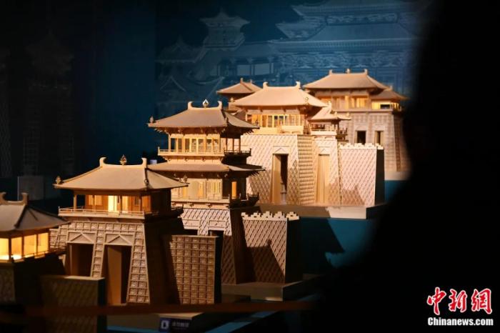 《千年?duì)I造——敦煌壁畫中的建筑之美》特展上的古代建筑模型。該模型的“單門道花磚城門”來源于莫高窟第159窟。李亞龍 攝