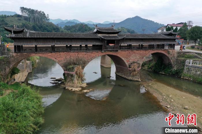 圖為11月7日,航拍貢川古鎮(zhèn)上建于明代的會(huì)清橋。中新網(wǎng)記者 張斌 攝