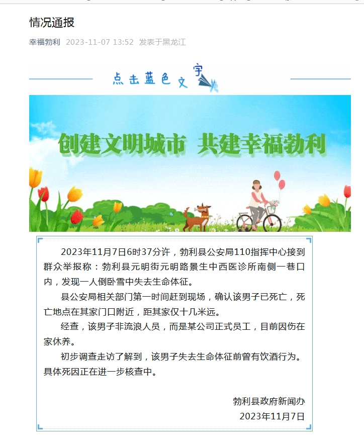 中新網(wǎng)11月7日電 據(jù)黑龍江勃利縣委宣傳部官方微信消息,黑龍江省勃利縣政府新聞辦7日發(fā)布《情況通報(bào)》。2023年11月7日6時(shí)37分許,勃利縣公安局110指揮中心接到群眾舉報(bào)稱:勃利縣元明街元明路景生中西醫(yī)診所南側(cè)一巷口內(nèi),發(fā)現(xiàn)一人倒臥雪中失去生命體征。