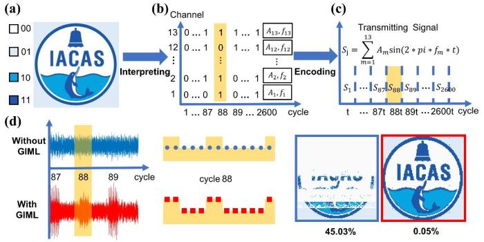 本項(xiàng)研究中,該團(tuán)隊(duì)進(jìn)一步將聲學(xué)所的所徽?qǐng)D案通過頻分復(fù)用的方式編碼在匹配層的透射頻帶內(nèi)進(jìn)行傳輸,圖案以13個(gè)通道進(jìn)行并行傳輸,傳輸準(zhǔn)確率達(dá)到99.95%,實(shí)現(xiàn)了水和空氣間的高容量精確通信。