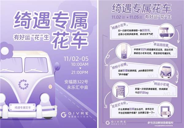 在設(shè)計(jì)風(fēng)格上,綺芙莉以品牌標(biāo)志性“綺彩紫”與花元素共同打造秋日沉浸式浪漫氛圍,擷取花之靈感,彰顯時(shí)尚型格,從花朵環(huán)抱的紫色巴士、紫色小花車、紫色長(zhǎng)椅等基礎(chǔ)架構(gòu),到薰衣草、紫藤花、毛絨玩具、花型抱枕等裝飾細(xì)節(jié),無形的氛圍感滲透于用戶所處空間的每個(gè)角落,為體驗(yàn)者打造可以釋放一切情緒和壓力的專屬沉浸空間,在城間gap中遠(yuǎn)離生活的喧囂, 在紫色花海中一起浪漫出逃,讓置身其中的人獲得心靈片刻的平靜和愉悅。
