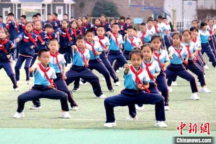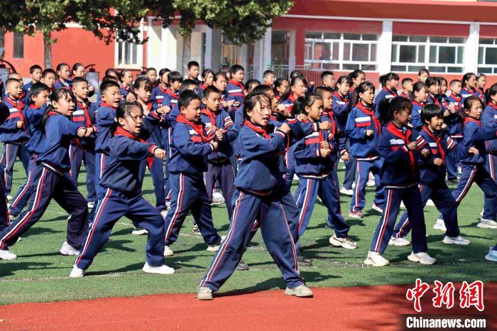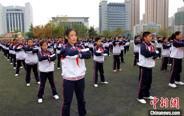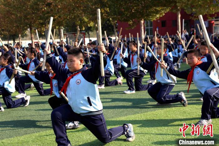 中新網(wǎng)濟(jì)南11月7日電(孫婷婷)胸前打、背打、跳打、蹲打……11月7日上午“陽(yáng)光體育大課間”,在位于山東省聊城市茌平區(qū)的山東政法希望小學(xué)操場(chǎng)上,富有地方特色的茌平平調(diào)秧歌民間小調(diào)音樂(lè)一響起,同學(xué)們雙手持棍,根據(jù)音樂(lè)有次序地打棒,熟練地跳起獨(dú)特的健身操。