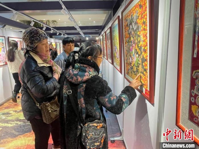 11月9日,全國(guó)農(nóng)民畫創(chuàng)作大賽作品展在吉林省樺甸市開展,色彩飽滿的作品吸引游人駐足觀賞。樺甸市委宣傳部供圖